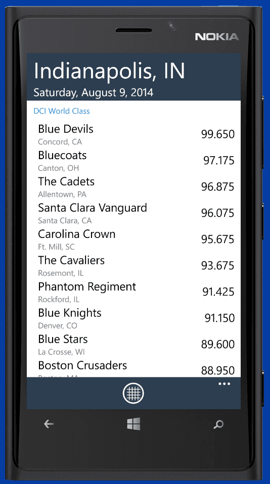 A few months later in the winter of 2014, I decided I would do my part and try to contribute a useful app to the Windows Phone ecosystem. I had been developing software professionally for several years and was confident in my ability to make a great app, I just needed an idea. Since this would be my first time developing a mobile app, I wanted to build something on the simpler side. Something that people would find useful, but not something that would be impossible to scale and maintain as a solo developer. I settled on an app for checking drum corps scores.