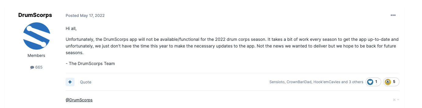 So, in the spring of 2022, Drum Corps Planet and I decided to officially end support for the DrumScorps app. It was a tough decision to make but it was the right one. I just didn't have enough free time to devote to keeping the app up and running in a way that met the quality standards we had set for ourselves. The 6 years the app was available to the public had been very rewarding. The countless messages we received from happy users over the years served as both a reminder of how proud we were of what we had built and of how sad we were to not be able to continue offering the app to the community.